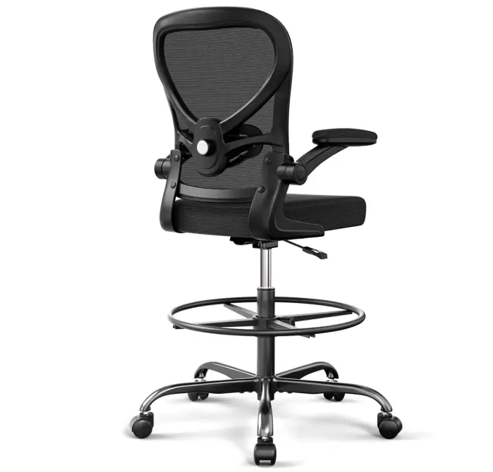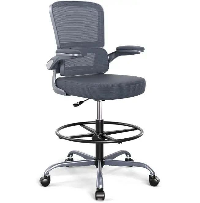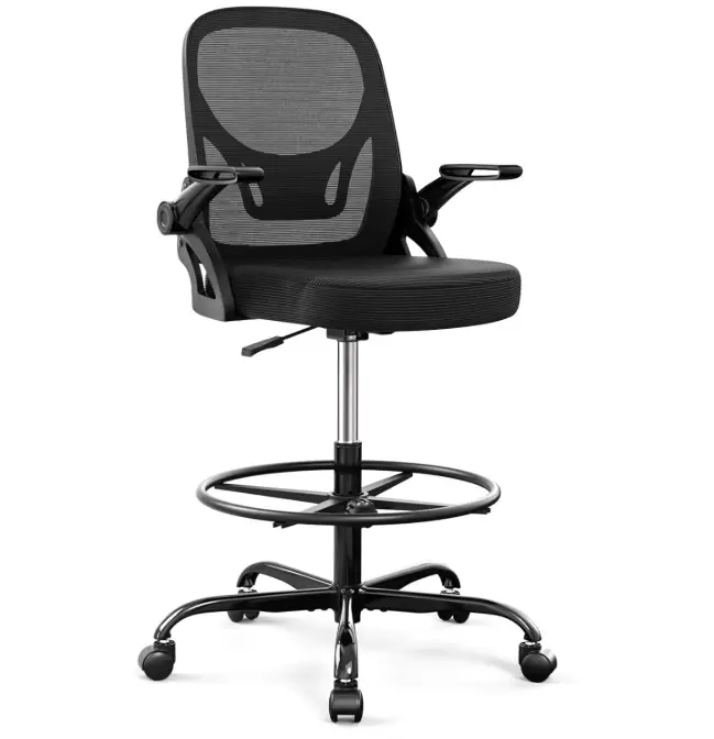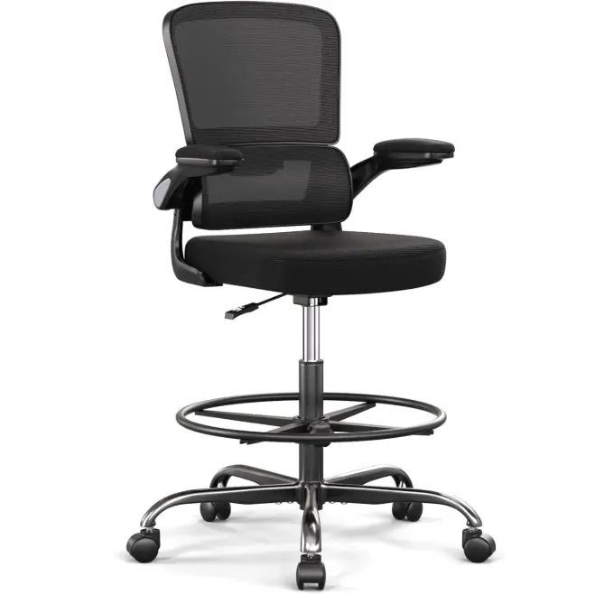 I purchased this chair specifically to use with my standing desk, and it has exceeded my expectations so far. The assembly process was simple and took roughly 20 minutes from start to finish. Right away, the chair feels solid and well-built, and the 450-lb weight capacity adds a lot of confidence in its overall durability. Nothing about it feels flimsy or unstable, even at its maximum height. The seat is wide and generously cushioned, making it comfortable even during long sitting sessions. The lumbar support sits in just the right position and does a great job of encouraging better posture throughout the day. One of my favorite features is the adjustable footrest ring, which makes a noticeable difference when sitting higher up at a tall desk. It helps keep my legs supported and reduces pressure over time. The flip-up armrests are very convenient when I want to pull in closer to the desk or need more room to move. Height adjustment is smooth and easy, and it reaches high enough to pair perfectly with a drafting table or standing desk setup. The wheels roll effortlessly across the floor, and the chair remains quiet with no squeaking or wobbling. Overall, this chair offers excellent value and feels thoughtfully designed for taller workstations. I would highly recommend it to anyone looking for a sturdy, comfortable drafting or office chair.