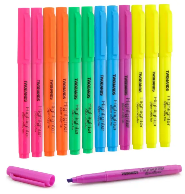 TWOHANDS Assorted Color Highlighters feature durable chisel tips that allow both wide highlighting and precise underlining for flexible note-taking. The 12 vibrant colors help you organize information clearly without overpowering the text underneath. Smooth, fast-drying ink reduces smudging and bleed-through, making them reliable for everyday study, office work, and planning